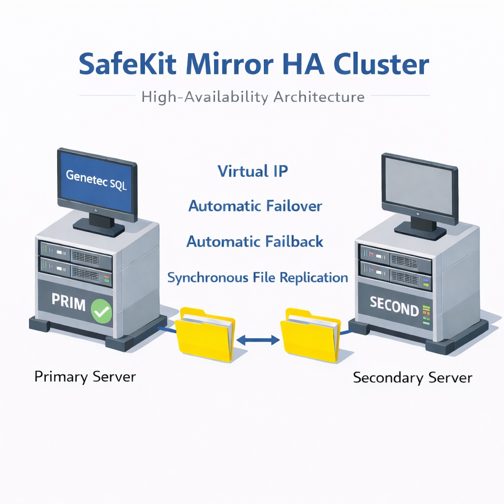 Yes. This article explains how to quickly implement a Genetec SQL mirror cluster without the need for specialized SAN management or complex HA clustering skills. By using SafeKit’s automated failover scripts to handle the replication and restart of Genetec SQL, you get a robust redundancy solution that is significantly simpler to deploy and maintain than traditional clustering solutions.