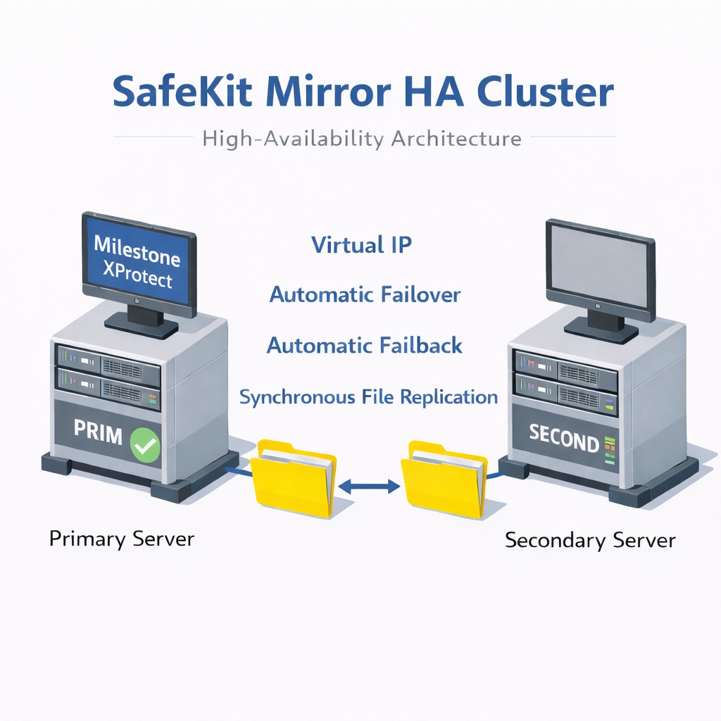 SafeKit brings high availability to Milestone XProtect between two servers of any brand.